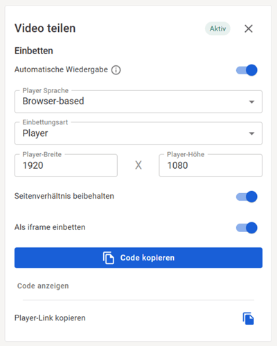 💡Wenn du den reinen Videoplayer ohne die Detail-Seite benutzen möchtest, wähle die Option "Player-Link kopieren" im Bereich „Einbetten“.