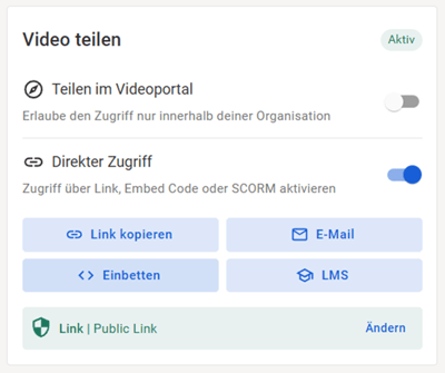 Klicke je nach Anwendungsfall rechts oben auf Direkter Zugriff oder Teilen im Videoportal.